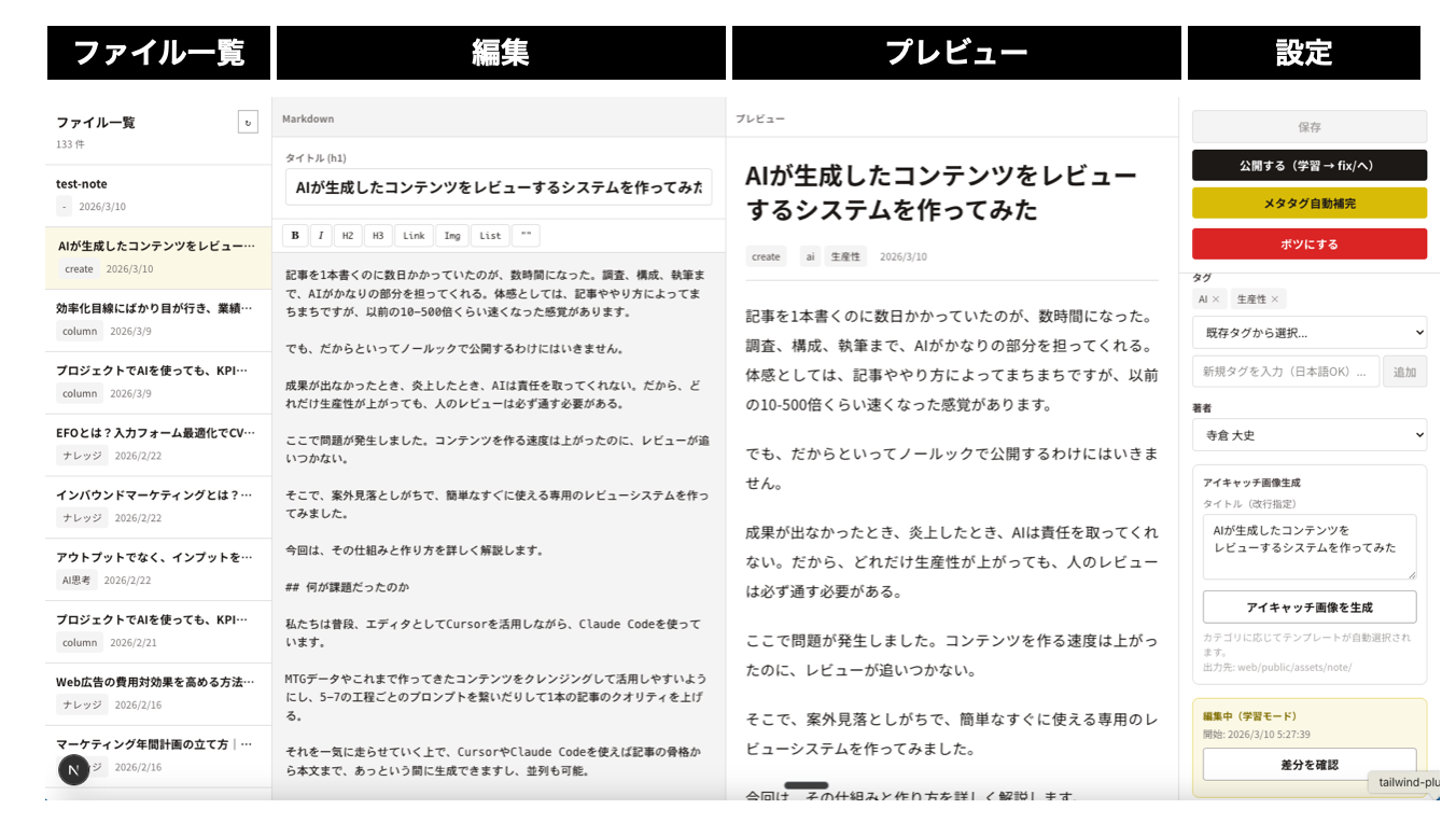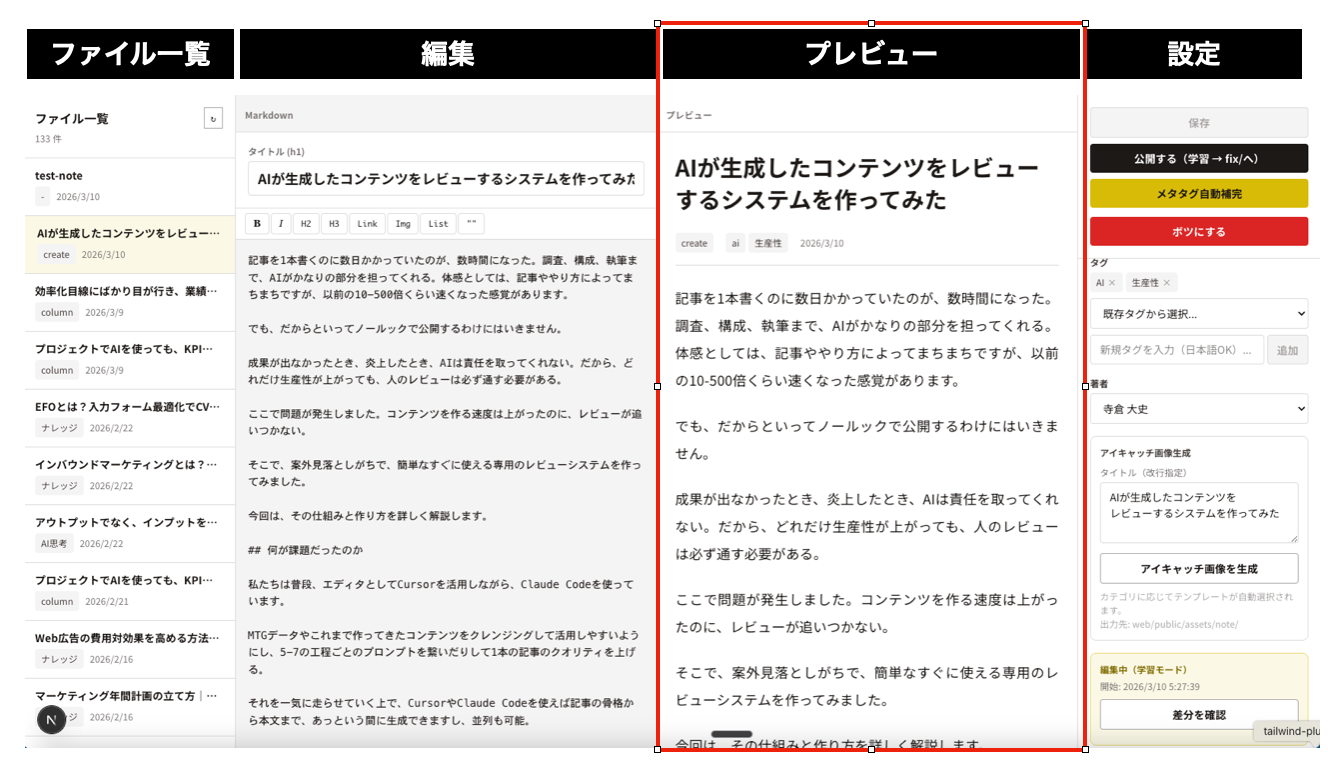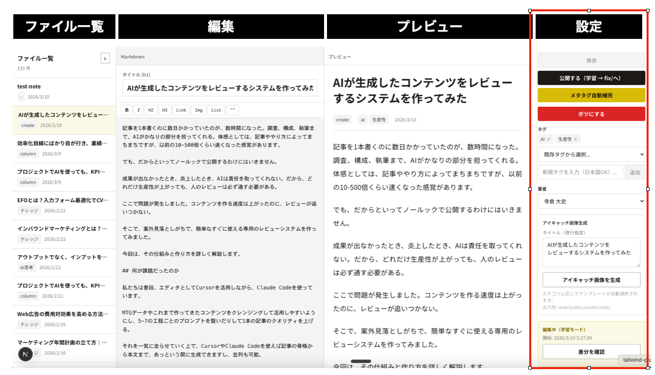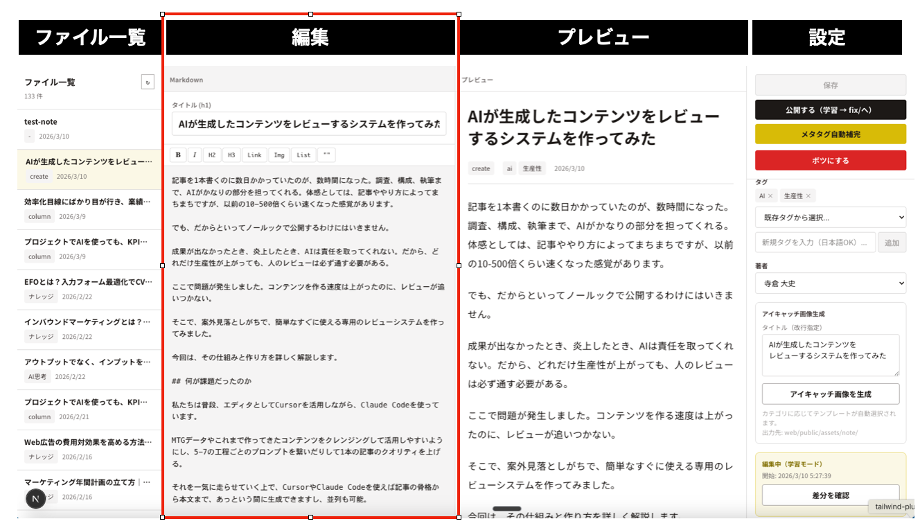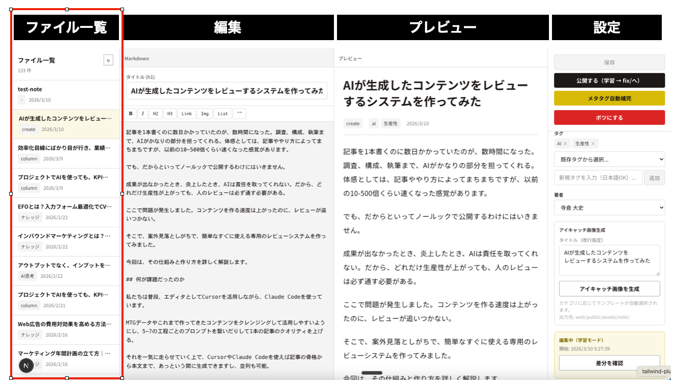 - メタ情報の編集:slug、カテゴリ、タグ、著者をドロップダウンで選択できます。frontmatterを直接編集しなくても、UIから変更できる。