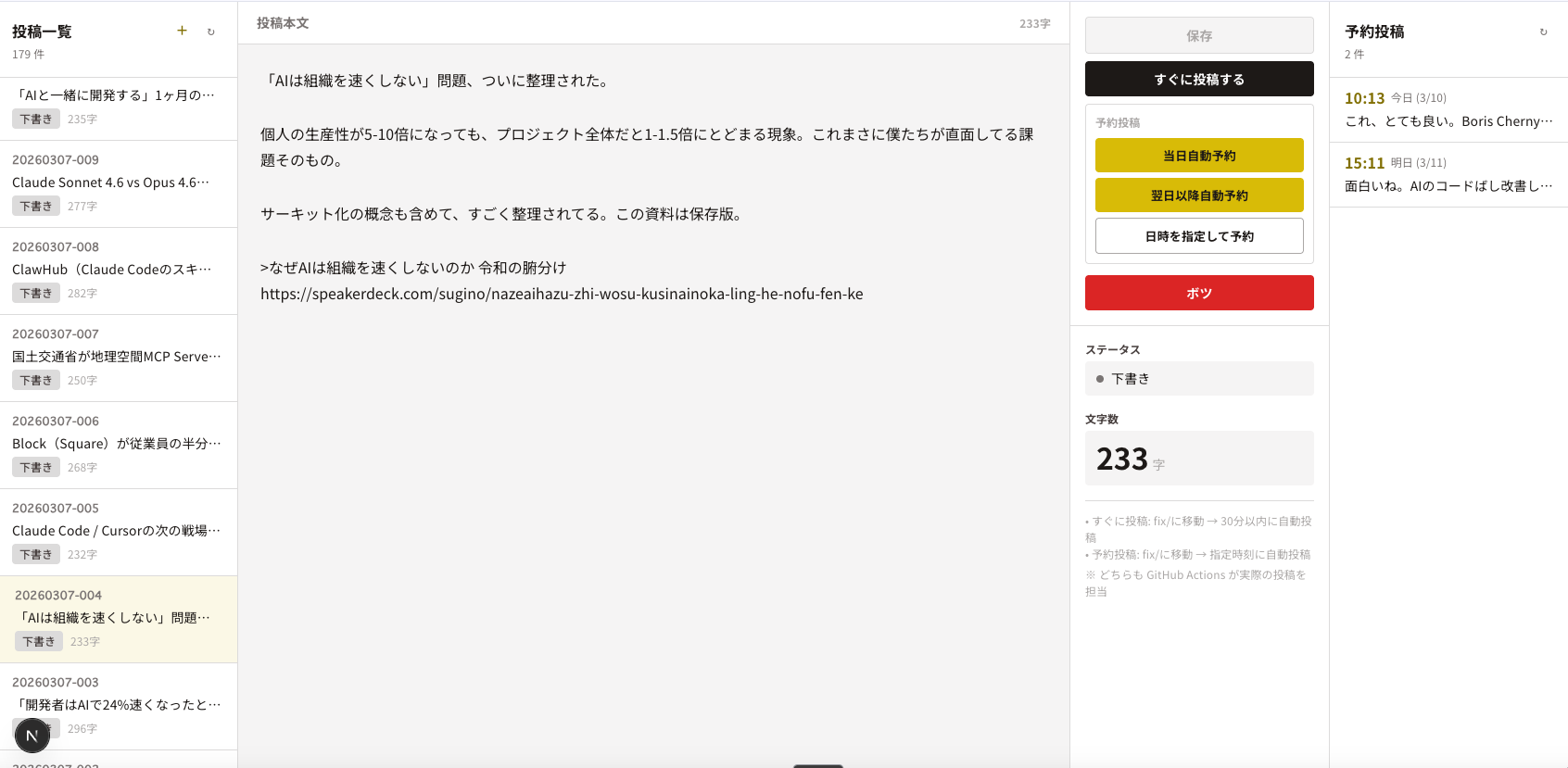 今は一人で使うバージョンですが、チームで使えるようにも設計したい。誰がどの記事をレビュー中か、どこまで進んでいるか、が可視化されると、チームでのコンテンツ制作がもっとスムーズになるはずです。